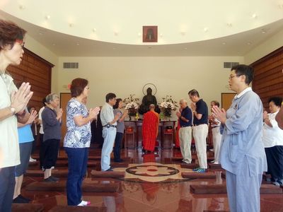 美洲菩提中心於八月十六日上午十時在報恩塔舉辦超度回向法會,虔誦【佛說阿彌陀經】和念佛繞佛,祈將法會功德回向堂上祖先與十方大眾。