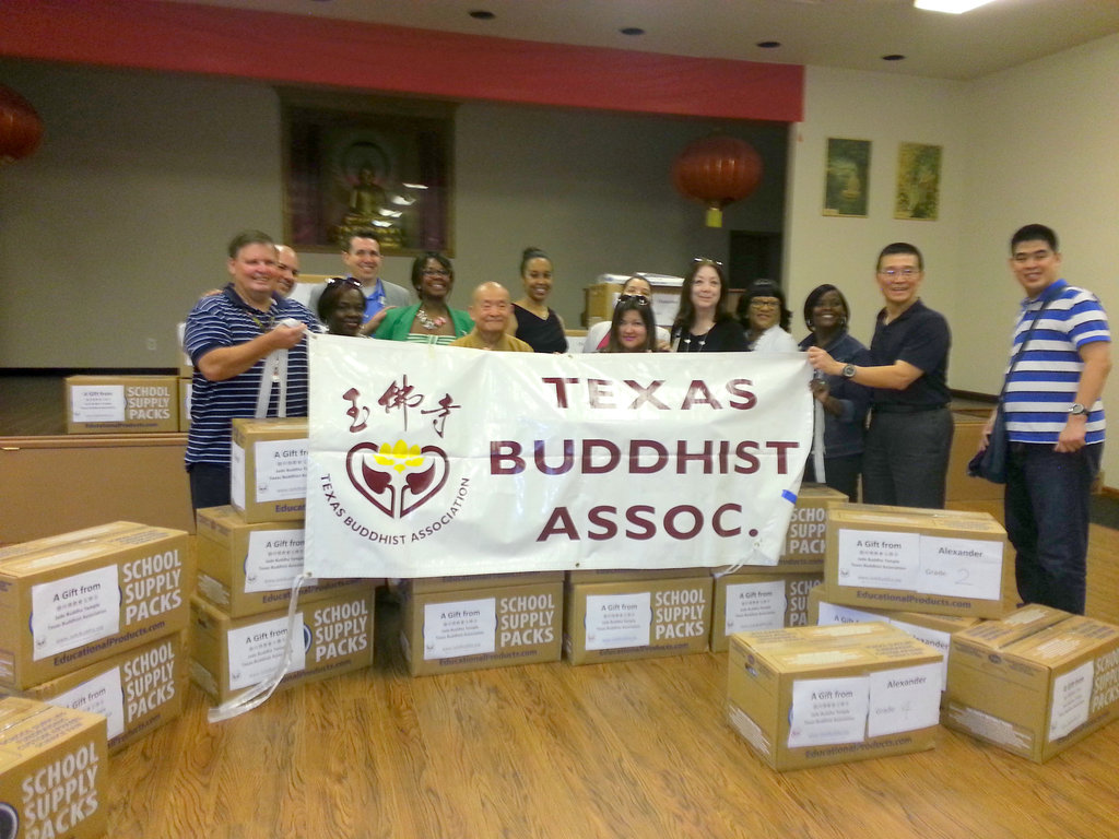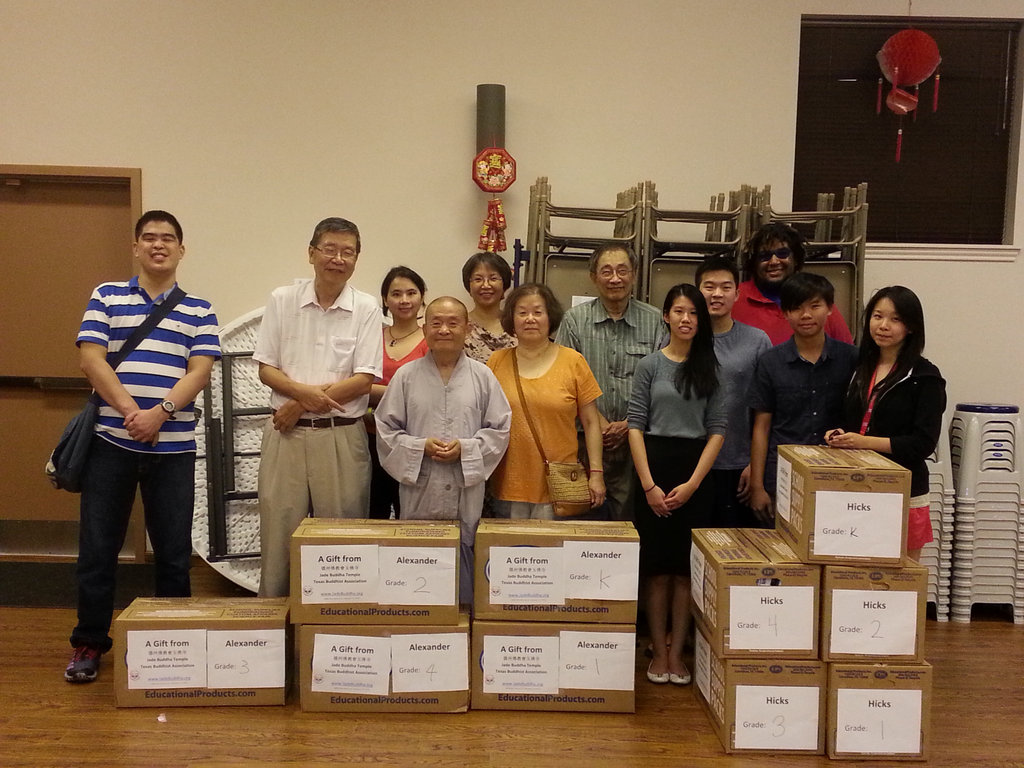 德州佛教會於8月27日下午三時,於玉佛寺青年活動中心舉行2015年教學用品捐贈活 動。休士頓愛立夫(Alief)學區六所小學及一所中學,包括: Viola Mahanay;Liestman;Howard J Hicks;Deborah Brown Alexander;A J Martin;Sarah Vickers Chancellor等小學,及Killough Middle School的校長及副校長們,自下午三時起,即陸續到玉佛寺領取文具,由融通法師及慈善組長呂振益於現場協助。佛教會此次共捐出二百三十五份文具,捐贈金額約為四千元。