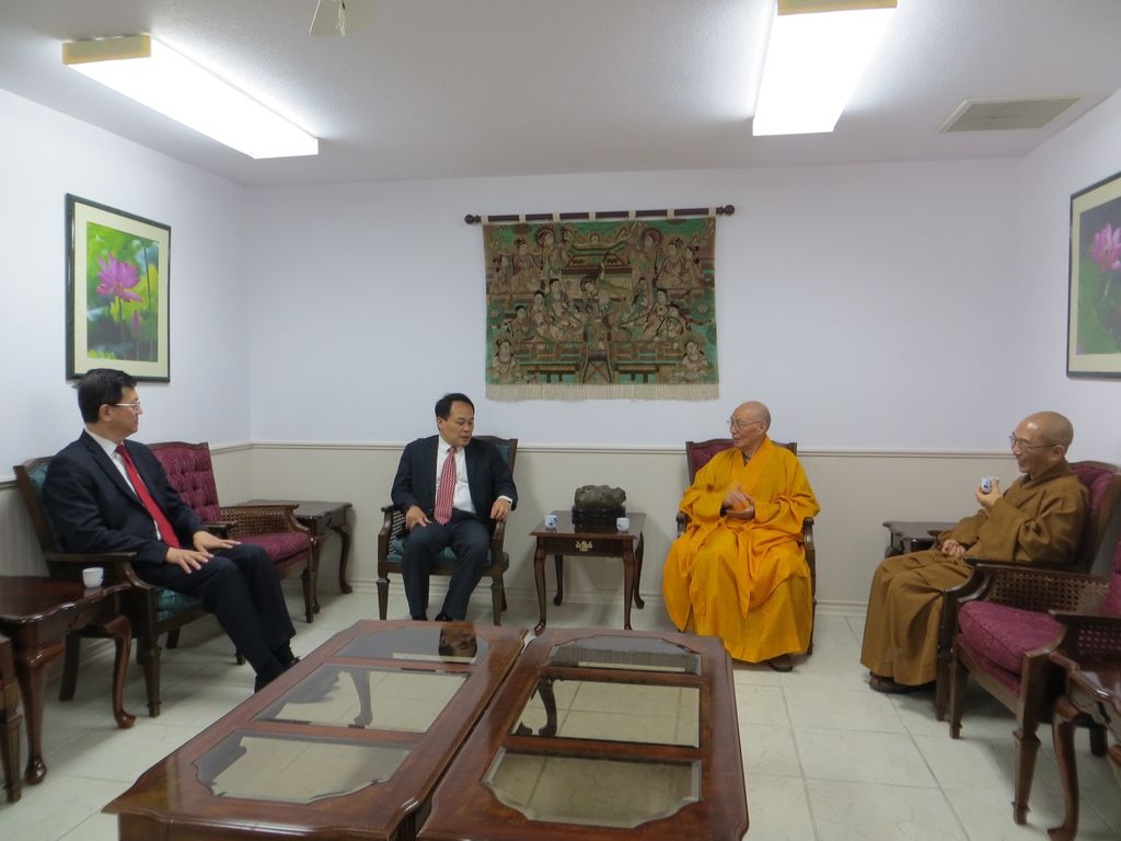 本會會長淨海長老、美洲菩提中心住持宏意法師,及多位常住法師和義工執事,於香雲堂前迎接。黃敏境處長於茶會中,特別代表僑務委員會頒發感謝狀予德州佛教會,感謝2014年高雄氣爆時佛教會的捐助,由本會會長淨海長老代表接受。