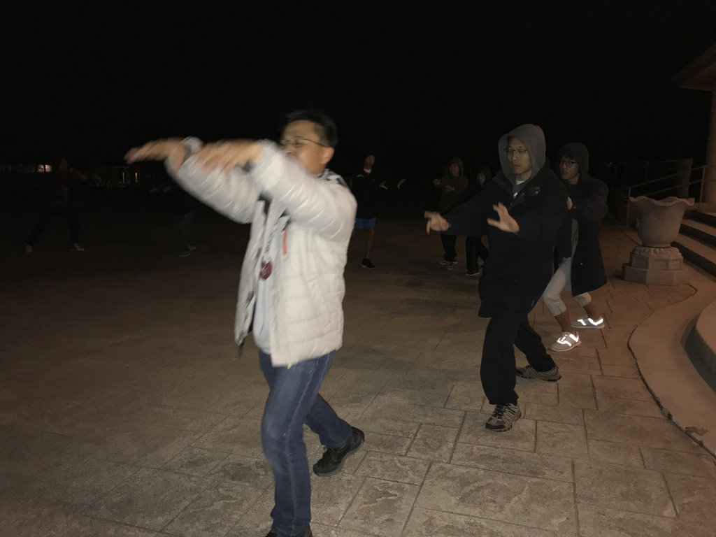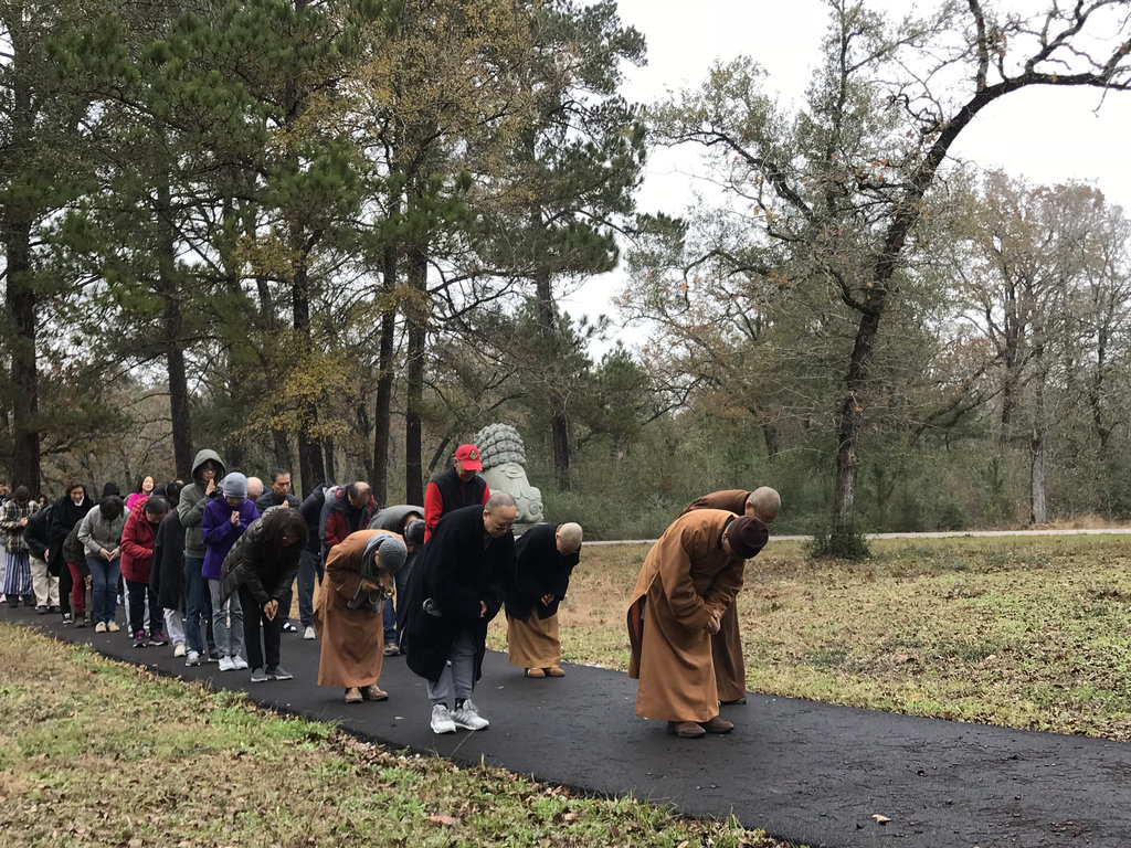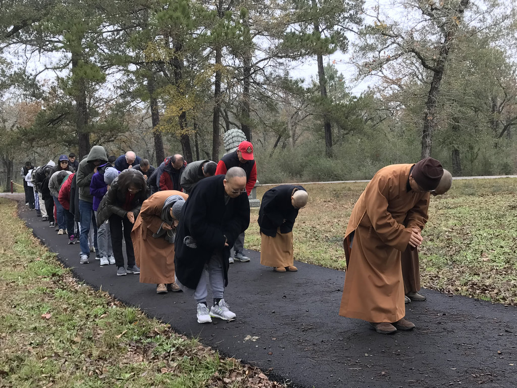 十七日佛學講座完畢,宏師父領眾經行,由成佛大道兩座獅子石像處三步一問訊往明心堂方向朝山。師父隨機開示,朝山是佛教修行的方法之一,可以培養心力和體力,並長養持續的毅力。並以虛雲老和尚為報母恩從普陀山起香,三步一拜,朝五台山的事蹟,說明朝山功德不可思議。