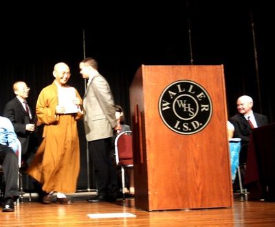 圓福法師、慧度法師與修道法師率領居士五位,於五月十六日下午六時三十分,抵達位於華樂郡的華樂高中(Waller High School),參加2013年華樂學區應屆高中畢業生「頒獎之夜」。